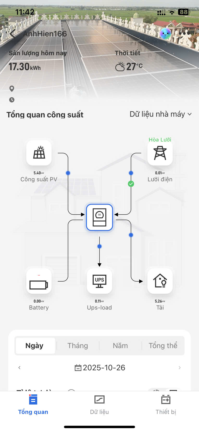 Tại dự án Cơ sở sản xuất giầy dép Hiền Soát 166 thông Bùng (DT 428) xã Ứng Hòa, TP Hà Nội, hệ thống điện mặt trời 15kW hoạt động ổn định, bám tải chính xác và tiết kiệm trung bình 60% chi phí điện hàng tháng.